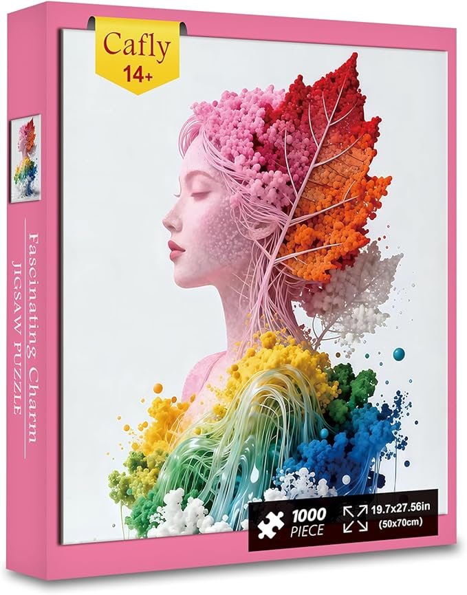 - 1000-piece adult puzzle, finished size 27.5*19.7 inches/70*50 cm, packaged in a beautiful and sturdy colorful box, with a high-definition reference poster included. The image shows a figure with a colorful leaf – like head, avant-garde and vibrant.